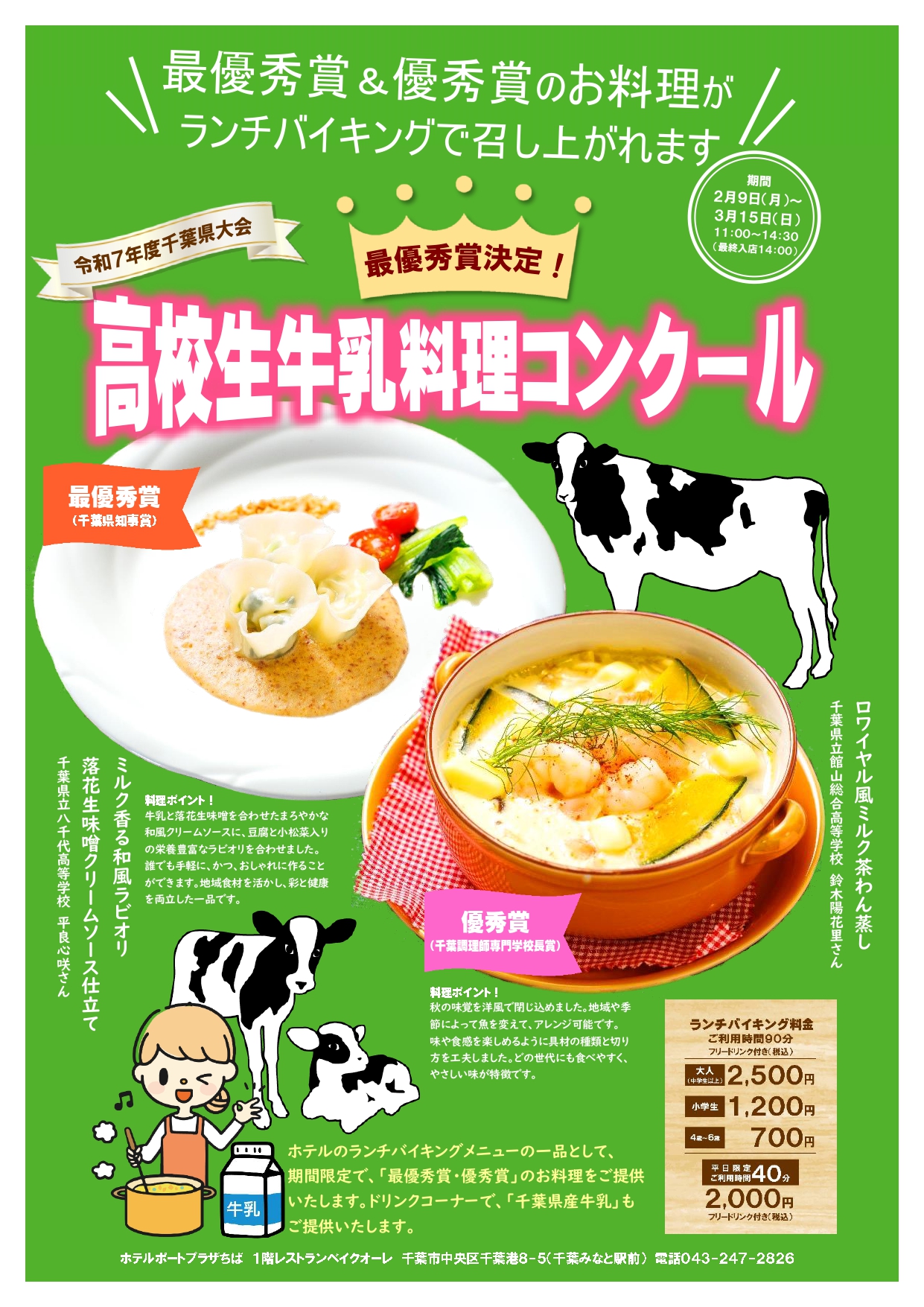 ホテルポートプラザちば様のご協力により、今年もランチバイキングメニューの一品として牛乳料理が提供されます。期間中は県産牛乳も提供されますので、高校生が考案した牛乳料理をぜひお楽しみください。